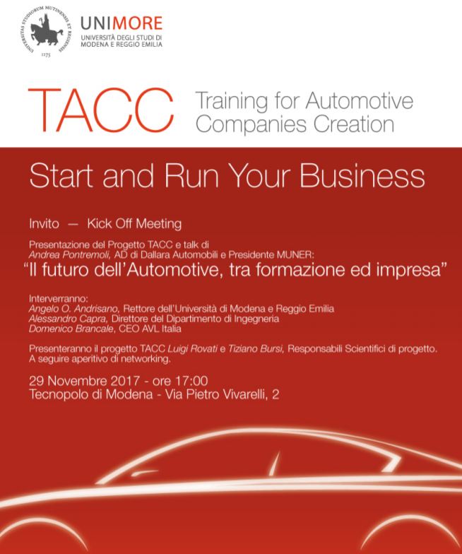 On 29th of November at 17 p.m will be launched the new innovative programme by UNIMORE: "Training for Automotive Companies Creation". The programme is addressed to who want to understand, study but above all, to engage in entrepreneurship and innovation in the automotive field. Motivated students but also professional will be able to take part in TACC programme, acquiring transversal skills for the development of the spirit of enterprise, coming up with an entrepreneurial idea, and create a start-up in the automotive field.